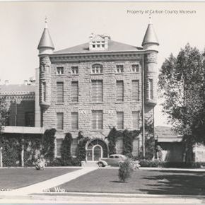 3 black & white print cards. Image of a multi level stone building with 2 spires on front corners, barred windows, an arch door. Grounds are landscaped with grass, trees & bushes with vines growing on the front of the building. More buildings extend to either side. A walk leads up to the front where a vintage car is parked. A lamp post is on photo right. Printed in white at bottom: "State Penitentiary Rawlins, Wyo. Sanborn Y-1400"