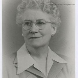 Update 2008: Black and white copy print (2). Studio portrait . Head and shoulders portrait of a woman dressed in a white blouse and light colored jacket. Her hair is grey, short and wavy. She is wearing glasses and circular earrings and looking to the left.