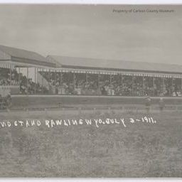 Update July 2011: Black & white print card of 2 sets of grandstands. One on photo left is smaller & is decorated with stars & stripes around spectator area. It has a canopy roof over the top. The one on the photo right is longer & also has a canopy top. Both are filled with people. On photo right are men standing & are on horseback in a line. On photo left is another group of people behind the fence. Printed on bottom in white: "Grandstand Rawlins,Wyo. July 3 - 1911"