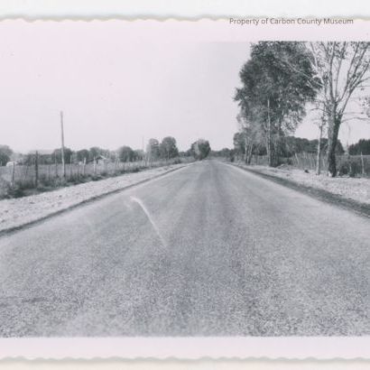 Update 2008: Black and white print. Snapshot. Image of a paved straight road with fence on both sides. Trees in midground at right. Large grove of trees, buildings and hay rolls in background.