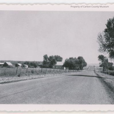 Update 2008: Black and white print. Snapshot. Image of a straight paved road with fence on both sides. Double trunk tree at center right. Ranch with farm buildings and grove of trees in background at left and center. Grove of trees in background at right.