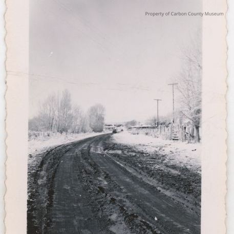 Update 2008: Black and white print. Snapshot. Image of a dirt road through a showy landscape. Fences run along on both sides with trees and utility poles on right. Grove of trees on left in background; buildings and hills behind. Two cars on road in background moving away from cluster of buildings.