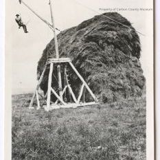 Black & white snapshot print. Image of a large haystack. A large wood frame scaffold with a pole extending from the top sets next to the stack. Another pole is attached & ropes move it up & down. At the end of the rope is a large hook with 4 tines. A man is sitting on the hook & is suspended in the air.