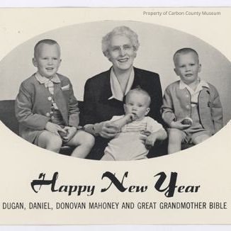 Happy New Year photo card of: Dugan, Daniel, Donovan Mahoney and great-grandmother Bible.