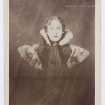 Update 2008: Sepia print. Cabinet card. Studio portrait. Mounted on off-white matboard. Half length (head to hips) portrait of a young woman dressed in a dark fancy fur trimmed cloak. With high collar and embroidered front jacket . She wears a 6 petal flower pin at her throat. Her hair is curly and appears to be pinned up. Painted backdrop behind. Gauzy effect all around except for her face.