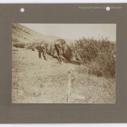 Update 2/2008: Sepia print. Snapshot. Mounted on brown matboard with curvilinear floral border and two binding holes in top edge. Image of two dark horses, butts in air and forequarters down with heads in a clump of bushes. Possibly drinking from a low stream. Brass in foreground and hills in background. More bushes in a line in midground left.