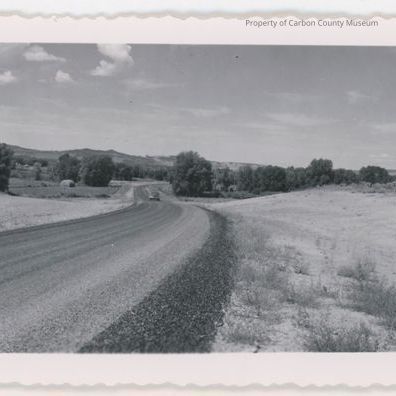 Update 2008: Black and white print. Snapshot. Image of paved road through dirt field into a tree filled valley. Hay field at left between groves of trees in background. Dense grove of trees in right background. Hills extend across image at horizon. Car traveling down road and just entering valley.