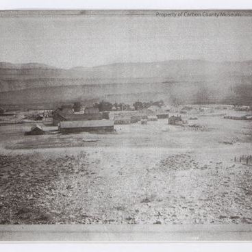 Black & white print & one negative of Fort Fred Steele. Foreground is sparely vegetated slope. On photo right is a corral. In photo center are two long, large buildings with scatterings of smaller houses to the sides. Some more buildings are beyond & trees rise above them. The river is seen in several places as it winds behind the fort. Hills are in the distance. View is from the south.