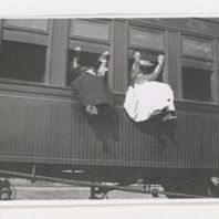 Black & white print of two women in long skirts with their legs hanging out of train car windows. One on photo left has a dark skirt & one on right has a light colored skirt & wears a light colored wide brim hat. They have their arms up, holding onto the raised window bottom with their heads inside.