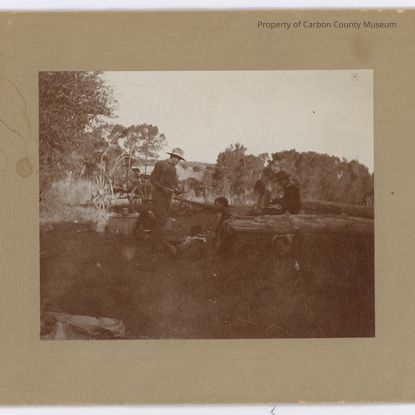 Update 2008: Black and white print attached tan matboard 5 1/2 x 6 1/2, of a group of five cowboys sitting and standing around a campfire with a dutch oven sitting on the coals? A kitchen box with supplies is sitting on side left of cowboys. A cowboy with huge crowned, wide brimmed light colored hat is standing holding a plate of food. Three others wearing high crowned hats are seated with plates of food on their laps. An unhatted cowboy is seated on the ground by the campfire with his legs stretched out and crossed at ankles holding his plate of food on his upper leg. A horizontal tree log is propped on a vertical tree log lying on the ground with one of the cowboys using it as a bench. A wagon with it exposed top frame is side left background with a treed area beyond it extending into horizon. Tall grass is in foreground. This photo was found in the Cronberg Ranch file. Mat has decorative embossed border on outer edge.