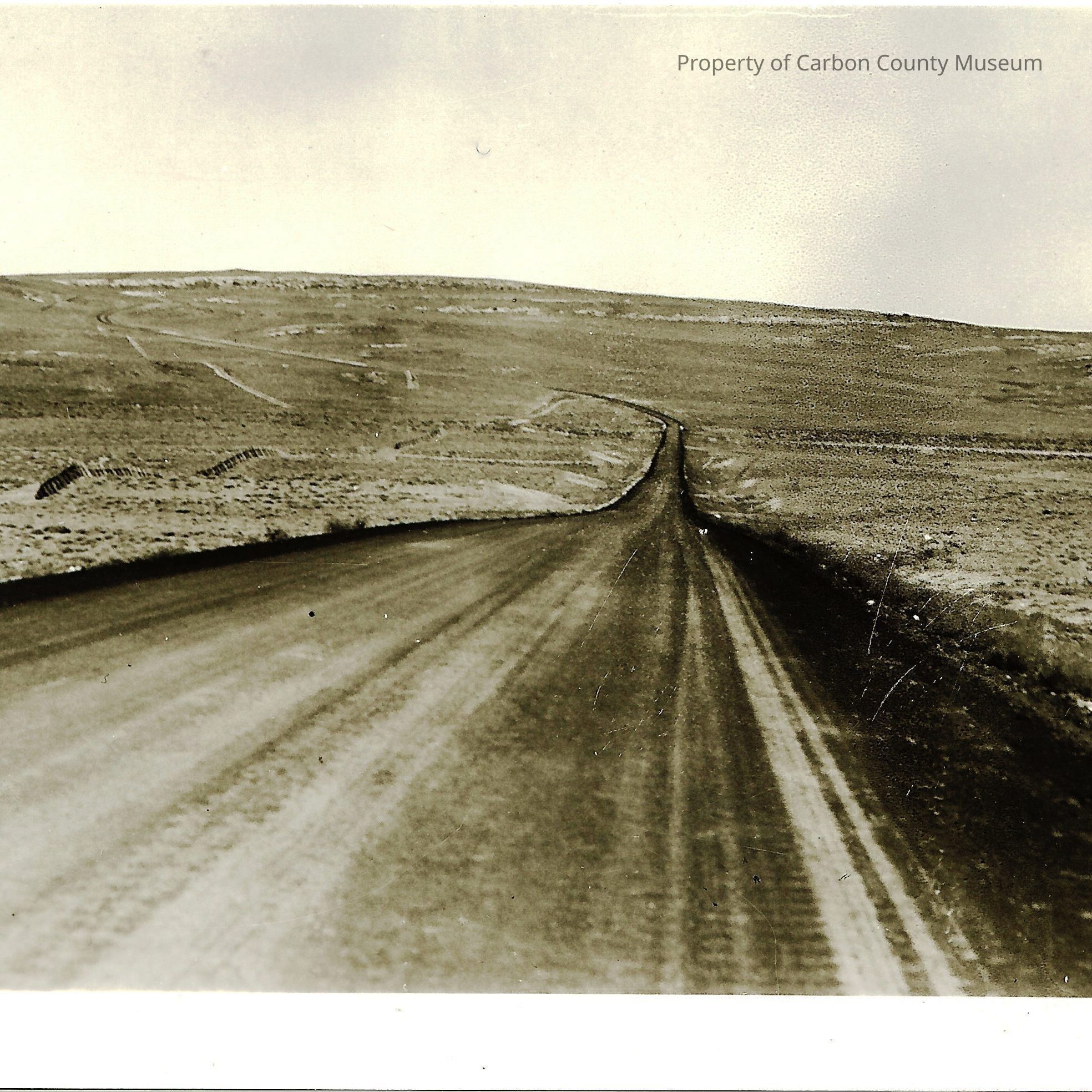 Update 2008: Black and white print. Snapshot. Image of a road through a sagebrush prairie with low hills in background.