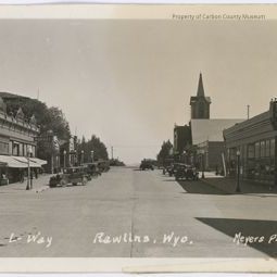 Black & white print card. Image of Cedar Street at Fourth Street looking east. Vintage vehicles are parked diagonally on both sides of the street. On photo right is a building with a lot of large windows & a facade above with dark trim. On the corner, at top, is a peak & inverted cone with ball on top decoration. In the distance is the steeple of a church. On photo left is a multi level stone building with 3 half moon shape parapets above the facade. Awnings are rolled out above lower level businesses & a sign hangs above with "Market" on it. The roof of a multi level building beyond is seen. Printed in white at bottom: "L-Way Rawlins, Wyo. Meyers Photo" Note: L-Way stands for Lincoln Highway or Lincolnway Highway.
