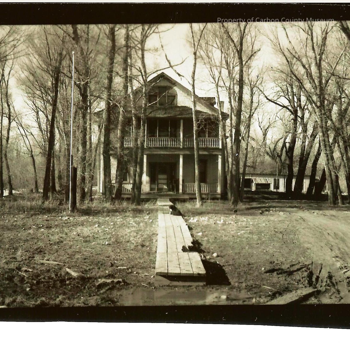 Update 2008: Black and white contact print from film negative. Snapshot. Image of a three story wood frame building with columned two story porch in front. Building surrounded by trees; wood out building in background. Four plank wood boardwalks to front porch. Flag pole with no flag at left in front of trees. Log on boardwalk.