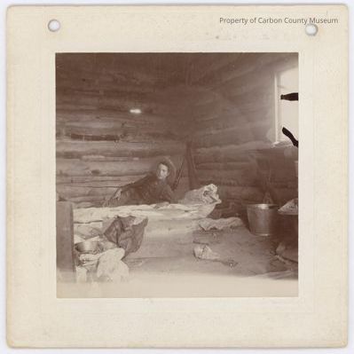 Update 2008: Black and white print attached to an ivory toned matboard measuring 5 1/4 x 5 1/4. Mat has decorative embossed edge 5/8" wide encircling outer edge of frame. Print shows a young man dressed in dark pants, shirt, vest and medium colored wide brimmed hat lounging on a primitive wooden platform bed. The view is inside a log cabin that has a piece of chink missing (top center) that caused light to reflect a circular aura from camera lens. There appears to be a bedroll on the floor in corner. Straw is strewn on the wooden floor. Metal bucket is beneath window. Gear on side left on floor. A wooden box? is partially seen on side left. A rifle is propped in the corner of room. Photo was found in Cronberg Ranch folder.
