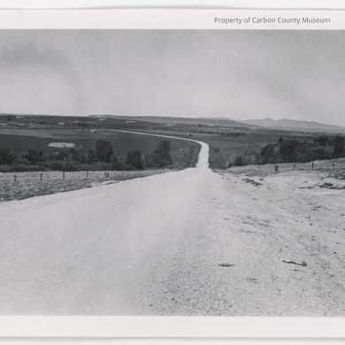 Update 2008: Black and white print. Snapshot. Image of a dirt or gravel road extending from a sagebrush prairie down into a grassy valley. Fences on either side. Groves of trees and hay pile in middle ground. More hay piles in fields as the road curves to left in background, hills on horizon.