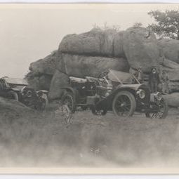 Update 2/2010: Black and white print. Snapshot. Image of two vintage right hand (English) drive automobiles parked in front of a large pile of boulders. three men are standing up against the boulders just right of center. Large rock embedded in the ground, partially blocking the view of the vehicle at left. Two large evergreen trees in background left and right. Vehicle at left has a large "C" on the front of the radiator (Colburn Company Automobile) and neither vehicle has a top. Men are dressed in casual suits; two at right are wearing goggles; all are wearing caps.