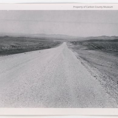 Update 2008: Black and white print. Snapshot. Image of a dirt or gravel road extending from a sagebrush prairie into rolling and rocky hills in the background. Fences on each side.