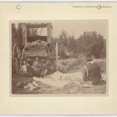 Update 2/2010: Sepia print. Snapshot mounted on light yellow matboard with a patterned border and two binding holes in top edge. Image of two men seated on the ground on either side of a light colored cloth spread on the ground. Man at right has back to camera and is dressed in casual work clothes and hat. Man at left is leaning back against canvas-wrapped(?) bundles below his neck and his knees are raised. He is dressed in casual work clothes and hat. Wagon appears to have been partially unloaded but still has one or two large boxes and a large fabric or the bed. Tall bushes in the background. Appears to be out of focus.