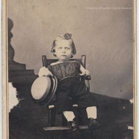 Black & white print carte-de-viste. Image of a small child sitting in a wood high chair. Child has on dark pants & shoes, white socks & a print shirt. A hat is held by the brim in child's right hand. Child has light hair that has a curl on top of head & by ears.