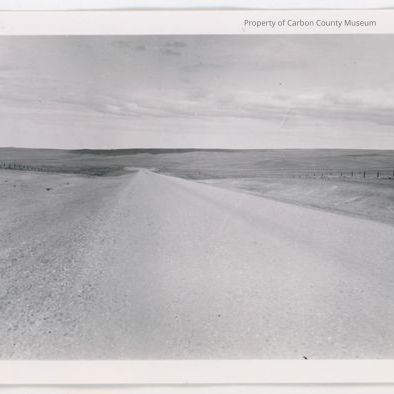 Update 2008: Black and white print. Snapshot. Image of dirt or gravel road stretching straight through a rolling prairie. Road curves to left in background, low hills on horizon. Fences run along road on either side.