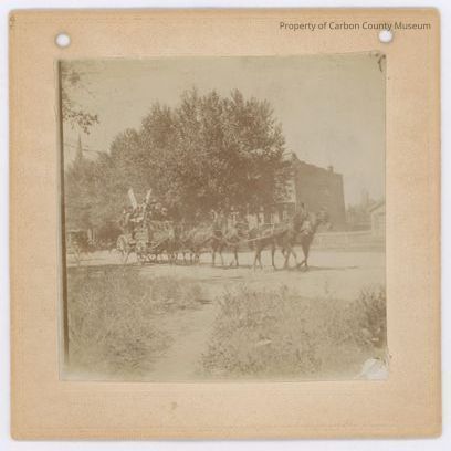 Update 2/2010: Sepia print. Snapshot. Mounted on tan matboard with patterned matboard and two binding holes in top edge. Image of a fully loaded stagecoach pulled by a six horse hitch, moving down a dirt street. Two patches of weeds and a dirt foot path in foreground. Trees and buildings in background. Vintage automobile on road at left. Large group of people piled on top of stagecoach along with two rectangular "wings" sticking up in center.
