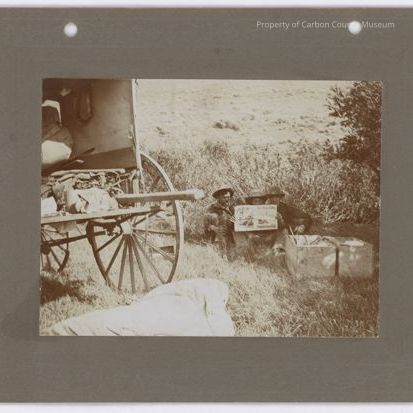 Update 2/2010: Sepia print. Snapshot. Mounted on brown matboard with curvilinear pattern border and two binding holes in top edge. Image of three men sitting close together on the grassy ground, looking at a periodical called "The Standard". Bushes and tree in mid-ground center and right; prairie in background. Back of wagon filled with equipment and long piece of lumber at left, large canvas-wrapped(?) bundle on ground in foreground left . Two full wooden boxes on the ground near the men. Men are casually dressed and wearing hats. Man in the center is holding the paper.