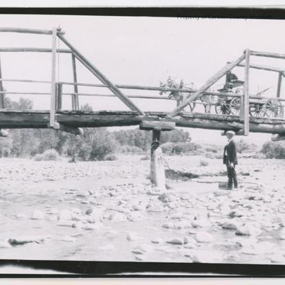 Update 2008: Black and white contract print from sheet film negative. Snapshot. Image of a log bridge across a rocky river bed with low water. Buggy with two horse hitch crossing bridge. Man in dark suit and cap standing on rock in river below bridge. Trees and brush on riverbank in background.