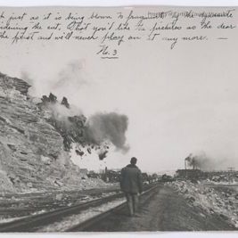 Update 2/2010: Black and white print. Snapshot printed on postcard paper, used. Image of blasting on a rock face along a railroad track. Man is walking along track in center foreground. Buildings, train and town in background. Note written in black ink on emulsion surface along top edge: "The same rock just as it is being blow to fragments by the dynamite used by the graders in widening the cut. Thot you'd like the pictures as the dear old rock is a thing of the past and we'll never play on it anymore-Stella. No. 3."