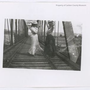 Update 2/2010: Black and white copy print and negative. Snapshot. Image of two women standing on a railroad track running over a tressel bridge. Hills, buildings and trees in background. woman standing at center is wearing a light colored dress and hat and is aiming a revolver at the second woman. Second woman is facing the first and has her hands in the air. She is wearing a dark skirt, patterned blouse and hat. Appears to be a double exposure-light image of a person in the dark skirt, another appears in the steel beam of the bridge at right. White spots at left and right are from original image.