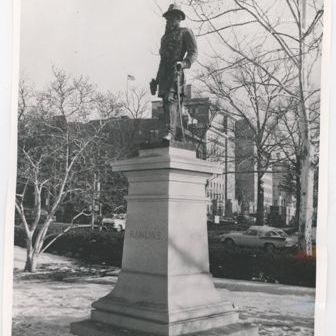 Black & white print of a statue on a square decorative pedestal. The base is tiered, then tapers at middle & has ridges enlarging & tapering again below statue. Statue base is dark & full size man stands on top. He is wearing a tall crown hat, dress coat that is thigh length & gloves. In his right hand are binoculars & his left is holding the handle of a sword with the point resting on the base of statue. On the pedestal "Rawlins" is engraved. In the background are multi-level buildings. A United States flag on a pole is on top of the first one. Cars of the 1950's era are in the parking lot. Barren trees are beside the statue & snow is on the ground.