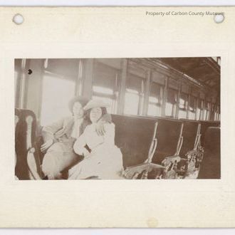 Update 2/2010: Black and white print. Snapshot mounted on off white matboard with patterned edge and two binding holes in top edge. Image of a man and woman seated in a railroad car. Woman is leaning into the man and he has his arm around her shoulder . Man's feet are propped up on the seat in front of him; he is casually dressed in a light colored suit and hat. Woman is wearing a light colored dress and hat.