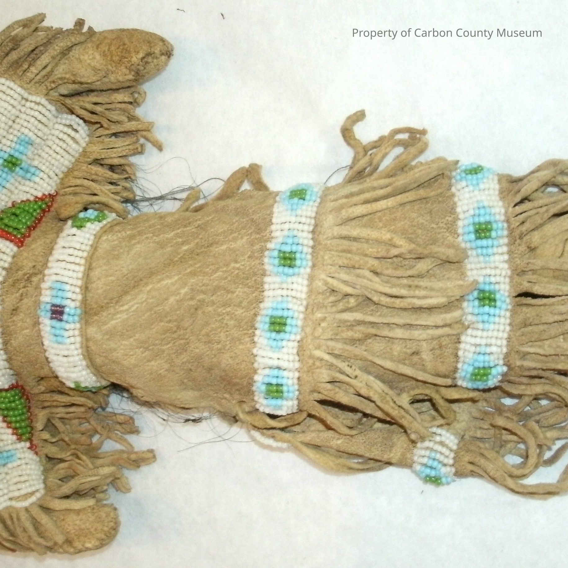 An 11.5" (high) x 6.5" (outstretched arms width) Cheyenne doll with beaded face and long black horsehair hair, ca.1910. Doll's hair is 6.5" in length, somewhat matted. Doll is soft stuffed and has tan suede arms and legs. She is wearing an elaborately fringed and beaded soft leather dress composed of beaded geometric designs at upper shawl bodice level with a beaded self tie belt and decorative beaded bands at center and lower edges. Decorative beads at these levels are primarily turquoise, green and white. Doll wears a three strand beaded purple necklace. Leather overskirts are placed over soft leather leggings. The skirts are tied at side left and right. Beaded footwear on feet.Collection