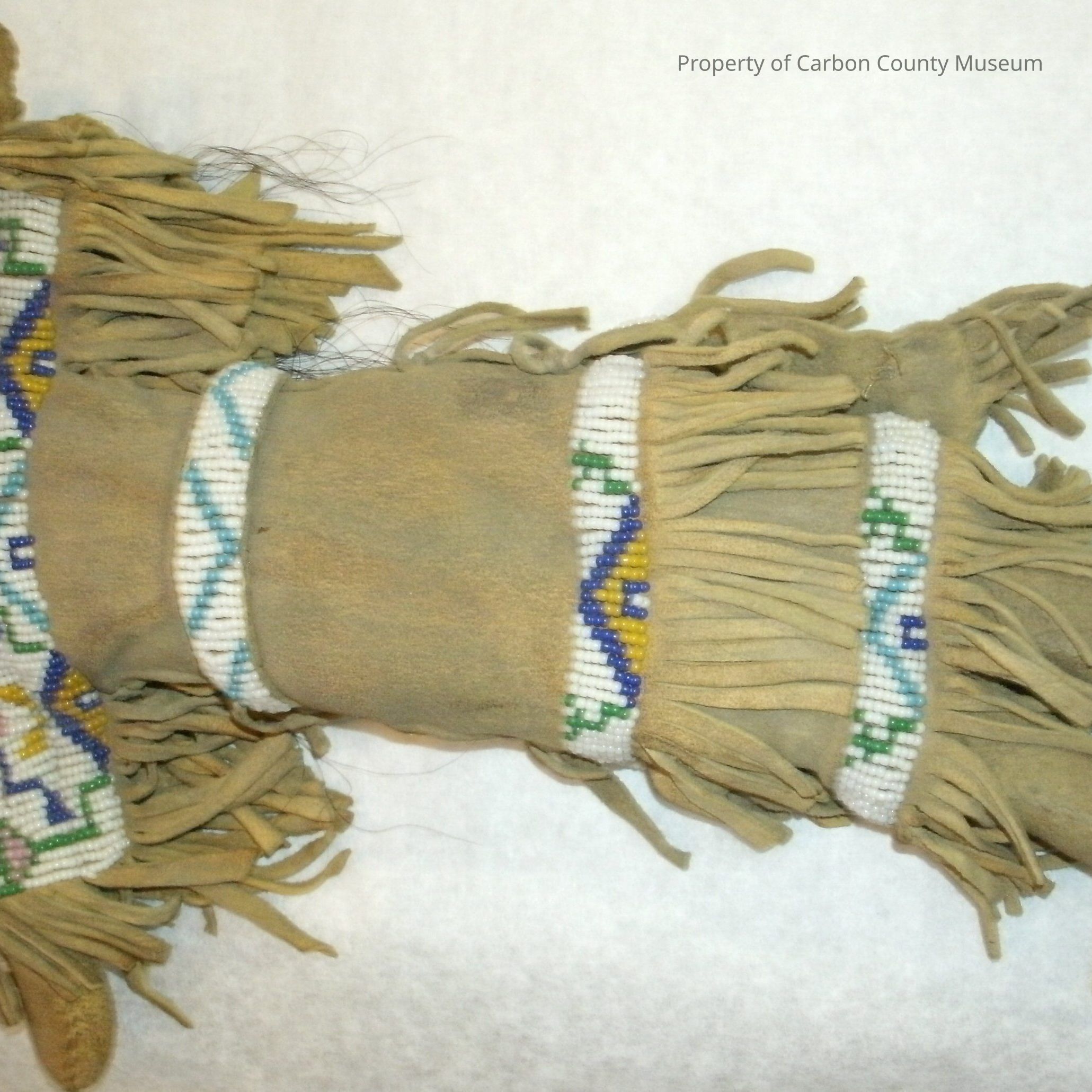 An 12" (high) x 8" (outstretched arms width) Cheyenne doll with beaded face and long black buffalo hair, ca. 1910. Doll's hair is 7.5" in length, somewhat matted. Doll is soft stuffed and has tan suede arms and legs. She is wearing an elaborately fringed and beaded soft leather dress composed of beaded geometric designs at upper shawl bodice level composed of white purple, green, beads predominately with a beaded self tie belt and decorative beaded bands at center and lower edges. Decorative beads at these levels are primarily light blue, green and white with some purple. Doll wears two strands of looped beaded earrings-primarily gold, purple, white. Leather overskirts are placed over soft leather leggings. The skirts are tied at side left and right. Beaded footwear on feet. Doll is more soiled than 2018.236.12.6.Collection