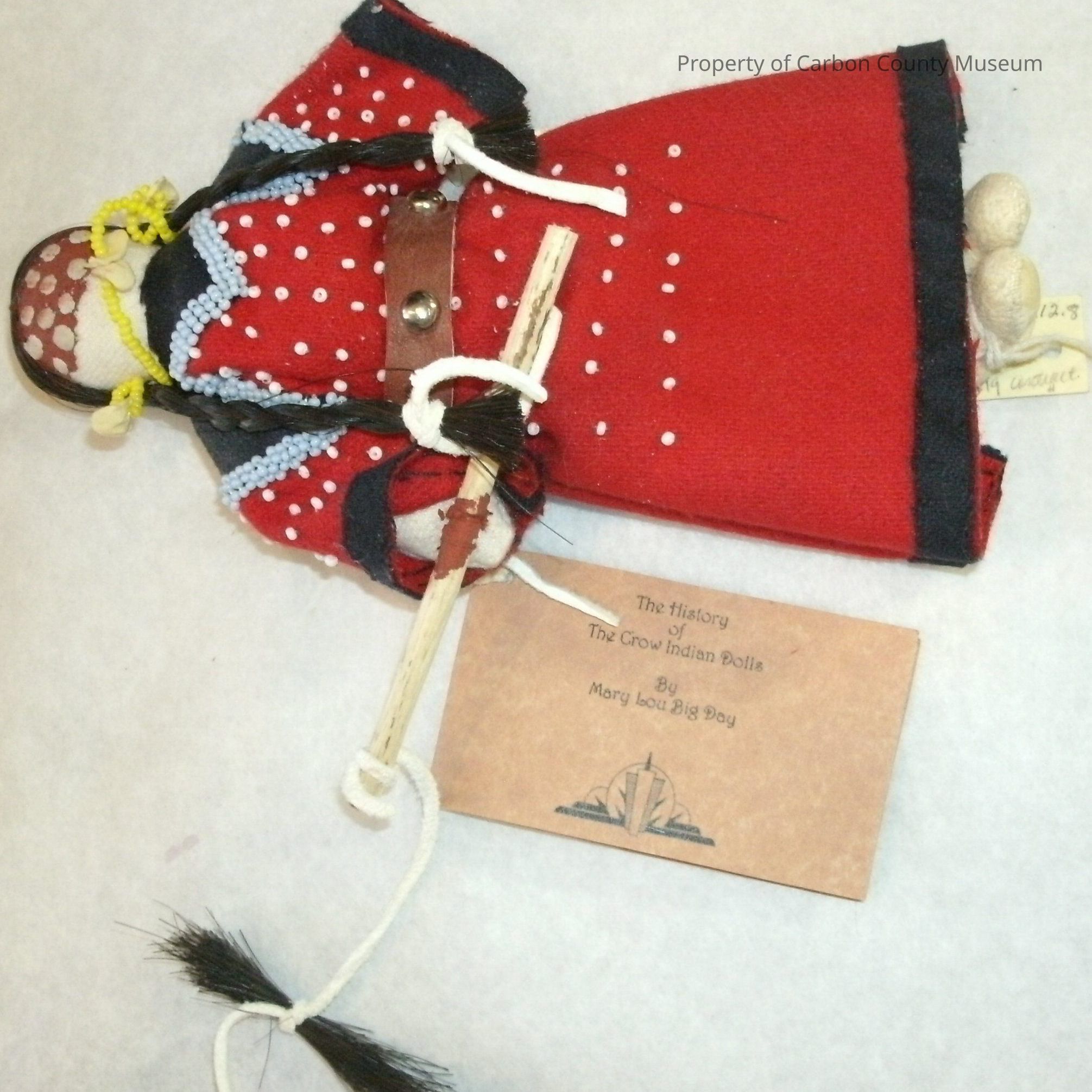 A Modern Grandmother Crow Doll made by Mary Lou Big Day in the 2000's. She carries a stick with horse hair bundle tied to it. Donor states that she is very modern. Ochre on dark brown hair at part. She wears a carved shell or bone chips beaded necklace and earrings. Leather wrapped leggings. Bought in Cody, Wy in 2003. She wears two 3" horsehair braids that come past her waist. Dress is made from red cloth with long wide sleeves and black accent trim on sleeve edge and hem edge. There are tiny white beads placed on long sleeves and lower waist. She wears a leather belt with silver studs that ties in back. Doll measures only 7.5" and 3.5" at top bodice area. There are light blue accent beads designed in "v" shapes at top of bodice. A small tan brochure is attached to the doll that is entitled, "The History of the Crow Indian Dolls by Mary Lou Big Day." It gives detailed information about her life and history.Collection