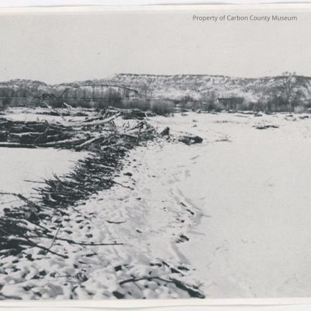 Update 2009: Black and white print of snow along river. Railroad bridge can be seen in distance. There are buildings on either end of bridge that are visible through the trees.