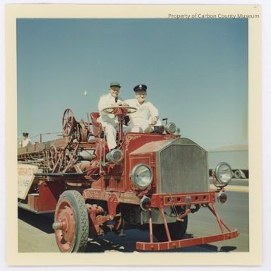 Written on back in blue ink: "R.F.D. Carl Seith and Dr. C. W. Jeffrey August 1958 on the Aerial Ladder Truck of the Rawlins Fire Department Rawlins, Wyoming Photo by Harry S. Cashman"Collection