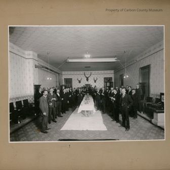 Black & white print on ecru mat. Photo of men in suits standing around a buffet table and eating. A large white cloth is on the floor under the table. Group of men standing on either side of a dining table. Table has light colored cloth still has dishes on it, with light colored cloth on floor under table. Men dressed in suits and ties. Most of the men are holding food in their hands. Back wall has mounts-one elk in the middle and a deer on either ride. Chairs are on side walls. Two doors on back wall. Stove on left of picture behind men. Chimney comes up and to the middle of room and out left wall.