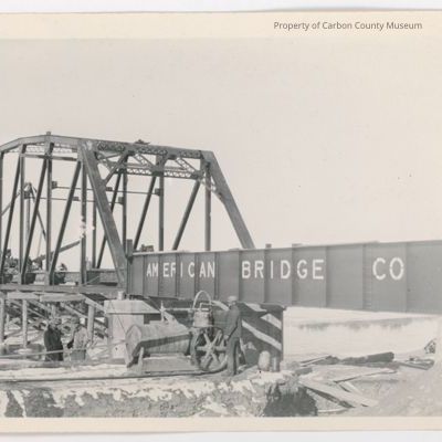 Update 2009: Black and white print of bridge construction. in the foreground is a piece of equipment with a tank, a wheel, hoses, and pipes. A man stands to photo right of equipment and two more men are behind and lower. More work crew is on bridge erecting side and top metal supports. Vertical metal end has "American Bridge Co." written on side. Concrete supports are on ends under bridge and wood supports under middle.
