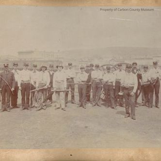 Written in pencil on yellow post it note: "UPRR's volunteer "Alert Hose Co. No. 2 circa 1894. Standing in the UP yards south of the 300 block of Front St Rawlins,Wyo."