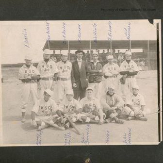 Black & white print on black mat. Image of a baseball team posed on a dirt field. All are wearing uniforms with "W S Co Jrs" on front except man standing at center who is wearing a dark suit and light colored shirt with bow tie. Spectators in a grandstand fronted with chicken wire in background.