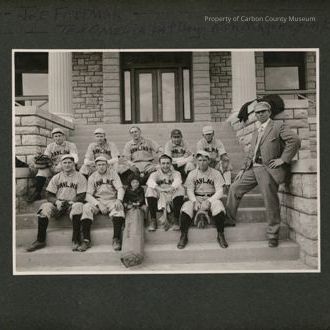 Written in pencil on yellow post it note: "Rawlins Baseball team on the front steps of the Elks Lodge at 403 W. Buffalo Street Rawlins, WY circa 1910-1911? Mgr. Perce Geiger stands on the right. "The red headed bat boy is Ted O'Melia. He was born in late July 1905".