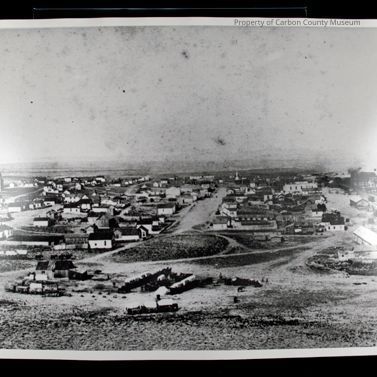 Copy print 1: Written on yellow post it note on back: "Rawlins 1892 looking east from Monument Hill down onto the "Wagon Park" at the west end of Cedar St."