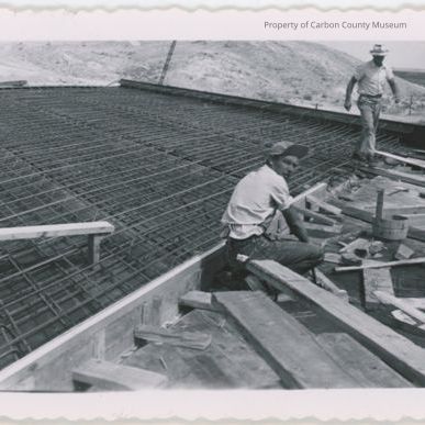 Update 2009: Black and white print of three men working on bridge top. A series of small metal rods framed by wood in photo left and center. One man is walking on a board, the other two are kneeling on ground working on boards that are outside the metal rods. Railroad tracks can be seen in distance.