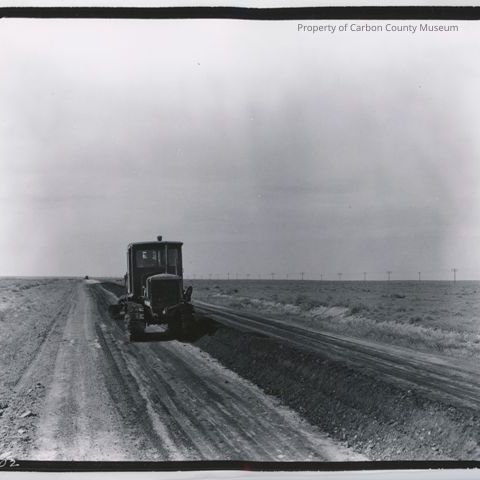 Update 2008: Black and white contact print and negative. Snapshot. Image of a road grader moving down a dirt roadbed. pile of dirt in center of road. Another piece of equipment in far background at left. Line of utility poles off to the right in background.