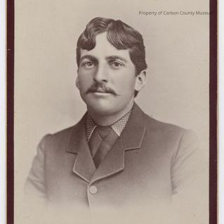 Update 2/2010: Black and white print. Studio portrait mounted on maroon matboard with gilt edge. Head and shoulders portrait of a young man dressed in a dark suit, dark tie/cravat and a polka-dot shirt. His hair is parted in the middle and is medium length;; he has a mustache.