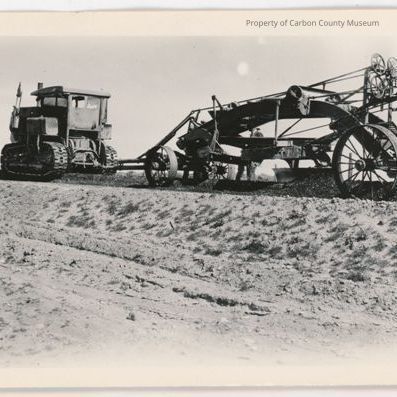 Update 2009: Black and white print of vintage dozer pulling vintage road grader. A row of black substance is in the middle of the road . There is a man sitting on back of the grader. A man standing behind grader is partially visible. Written on back in pencil: "Road mix-oiling Rawlins-Parco 1931".