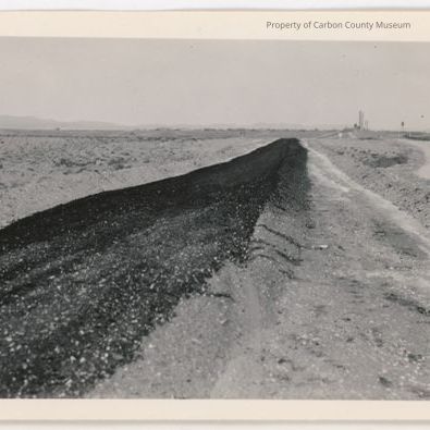 1st copy black and white print. Written on back in black ink: "Parco-East". Written on back in pencil: "Road mix-oiling Rawlins Parco 1931". Stamped on back: "Wyoming Highway Department Photo."