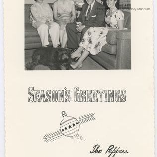Update - 2009: Black & white print. Printed as a Christmas card on scalloped-edge paper. Printed in lower half in black ink: "Season's Greetings" [ornamental & evergreen branch] "The Peppers". Image in top of a family seated on two love seats in the corner of a room. Man, woman, younger woman & young man, plus a dark dog at their feet.