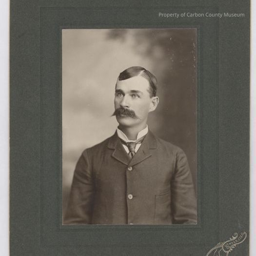 Update 2009: Black and white print. Photo of a man in a dress suit and tie. He has a medium long mustache. Hair is short, parted on the right and combed to left.