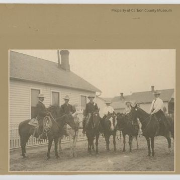 Update 2009: Black and white print. Photo of 3 men, 1 lady, 1 young girl, and 1 young boy all mounted on horses. Horses and riders form a half circle on an area in front of some house with a fence between riders and houses. All riders have on hats. Lady and young girl have on long skirts, men have on jackets. Lady and young girl have on long sleeved shirts. young boy has on long sleeved shirt.